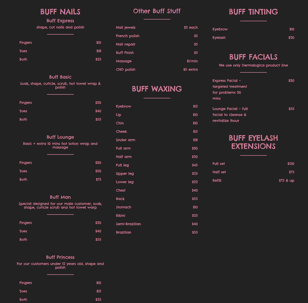 Unleash your inner beauty and face the world in style. Buff provides today’s modern women with the ultimate in beauty lavishness. Our customer get to enjoy a trendy and highly relaxed environment. Offering the highest quality service and stringent hygiene standards is our goal. Fun and with flair, geared at offering consistent and luxurious pampering services to you. Our ever-expanding services includes manicure, pedicure, shellac, bio sculpture gel, full body waxing, threading, facial, eyelash extension and more.