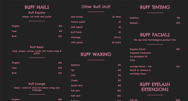 Buff Nail Lounge is a little piece of Manhattan, right here in downtown Toronto. The stylish nail and beauty bar offers efficient and perfectly executed, yet inexpensive nail and waxing treatments. Open since July 2005 in the St. Lawrence Market neighborhood, Buff offers exceptional value in all its beauty services. Obsessed with safety, this immaculately clean and chic environment keeps longer hours than most salons, and has a “no attitude, no acrylics” policy. Buff consistently ranks as a top beauty destination for Toronto’s dashing divas and fashionistas.